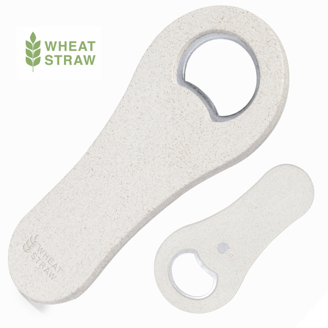 Abridor de botellas fabricado en caña de trigo. Cuenta con un imán que permite adherirlo a cualquier superficie metálica. Presentado individualmente en bolsa de papel reciclada. La caña de trigo fomenta la utilización de materias primas naturales, reduciendo así las emisiones contaminantes. Magnético