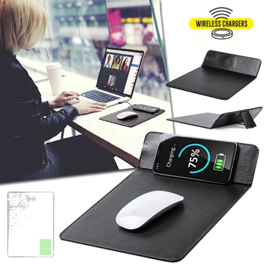 Alfombrilla de polipiel con cargador inalámbrico integrado y capacidad de carga de 1.000 mA -cable micro USB incluido- Con base antideslizante y soporte para móvil integrado. Compatible con dispositivos equipados con tecnología de carga inalámbrica y presentada en atractiva caja de diseño. Inalámbrico 5W. Antideslizante