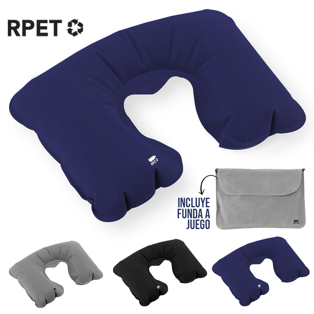 Almohadilla inflable para cuello de suave y confortable ajuste, disponible en variada gama de colores. Fabricada en antelina RPET y presentada en funda individual a juego de RPET. Logotipo RPET en almohadilla y funda.El material RPET se elabora a partir de plástico reciclado, para así fomentar la reutilización de residuos plásticos y ayudar a la sostenibilidad del planeta. Funda Poliéster RPET