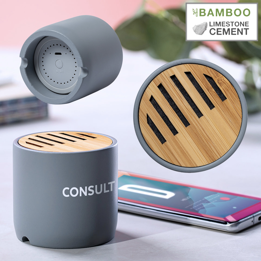 Altavoz Bluetooth en combinación de piezas de bambú de corte nature y cemento de piedra caliza, un conglomerante formado por la mezcla de materiales naturales, principalmente piedra caliza molida y agua, obteniendo un material de gran consistencia y durabilidad. De tamaño compacto, con conexión Bluetooth® 5.0 y 3W de potencia. Compatible con iOS y Android, incluye cable de carga micro USB y viene presentado en atractiva caja de diseño. Disponible manual de instrucciones español e inglés. Conexión Bluetooth. Potencia Sonido 3W. Batería 300 mAh
