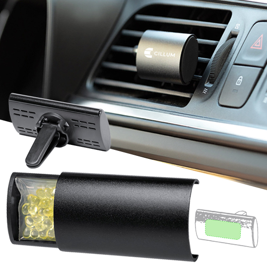 Ambientador para rejilla de coche en elegante diseño. Con frontal deslizante en aluminio granulado y resistente pinza para rejilla. Con bolitas de perfume de aroma limón y disponible en acabados plateado y negro. Aroma Limón