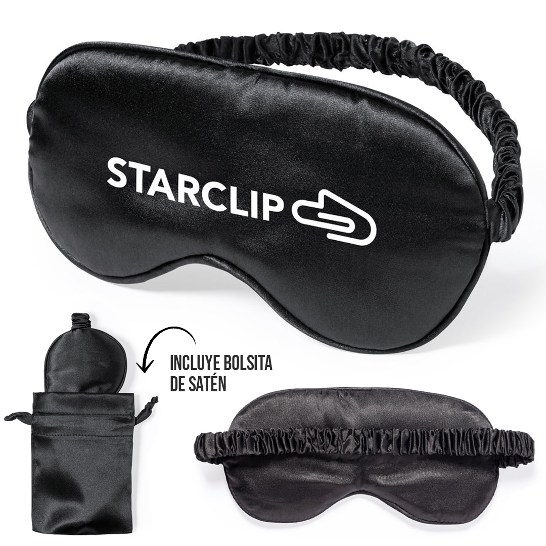 Antifaz de descanso en suave satén, con cinta elástica a juego. Presentado en bolsita individual de satén con cierre de cordón a juego. Funda Satén