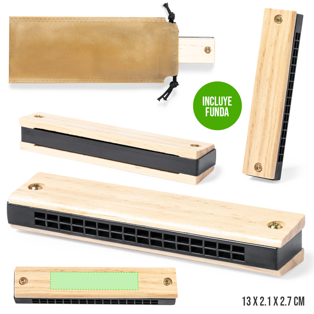 Armónica con tapas fabricadas en resistente madera natural de pino. Funda de presentación a juego con cordones de cierre. Funda Non-Woven