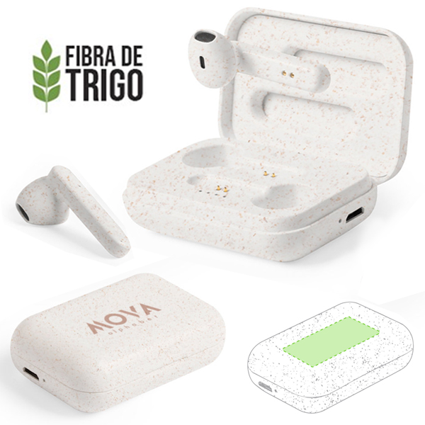 Auriculares intraurales de línea nature. Conexión Bluetooth® 5.0 y carcasa en caña de trigo, para así fomentar la utilización de materias primas naturales y reducir las emisiones contaminantes. De diseño ergonómico, incluyen botón de control táctil integrado en el auricular, con base de carga a juego y luz LED de estado de carga. Función manos libres y recargables, con cable micro USB incluido. Presentados en estuche individual de lujo con tapa de bisagra y en atractiva caja de diseño eco. Conexión Bluetooth. Batería 35 mAh/ Base Carga 400 mAh