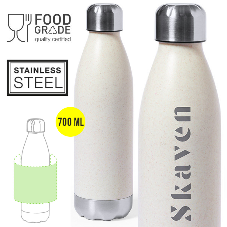 Bidón en combinación de PE veteado con base y tapón en acero inox. De 700ml de capacidad, con tapón de seguridad libre de BPA. Certificación Food Grade, garantizando la seguridad cuando los alimentos entran en contacto con el material usado para fabricar el producto. 700 ml