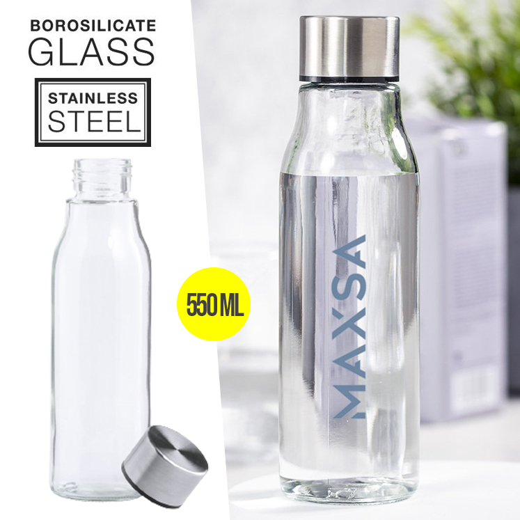 Bidón en alta calidad, de 550ml de capacidad. Fabricado en cristal de borosilicato, que ofrece una resistencia y durabilidad excepcionales, alargando su vida útil y pudiendo ser reutilizado infinidad de veces. Tapón en acero inox, libre de BPA. Presentado en atractiva caja de diseño. 550 ml