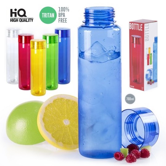 Bidón de 780ml de capacidad en material tritán resistente al calor y libre de BPA. Con tapón a rosca de seguridad, disponible en variada gama de colores y presentado en caja individual. 780 ml