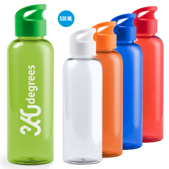 Bidón en alta calidad de 530ml de capacidad en material tritán resistente al calor y libre de BPA. Disponible en variada gama de colores translúcidos, con tapón de rosca a juego. 530 ml