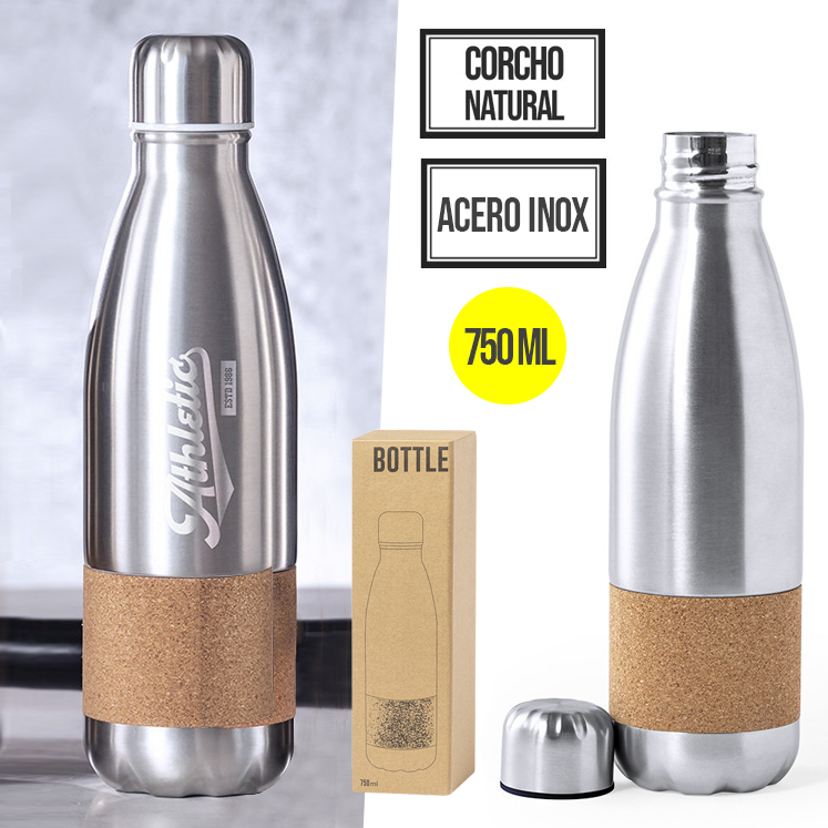 Bidón de línea nature, en combinación de materiales acero inox de acabado mate y corcho. 750ml de capacidad, con tapón de seguridad y presentado en atractiva caja de diseño eco. 750 ml