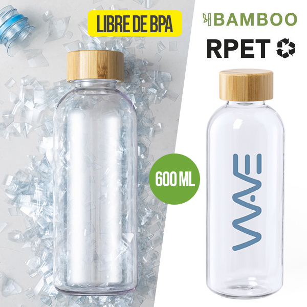 Bidón de línea nature y 600ml de capacidad. Libre de BPA, con cuerpo en RPET, elaborado a partir de plástico reciclado para así fomentar la reutilización de residuos plásticos y contribuir a la sostenibilidad del planeta. Con tapón a rosca en bambú. 600 ml