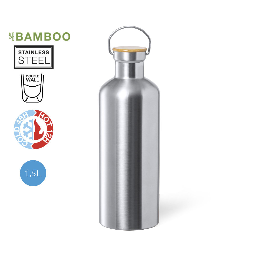 Bidón térmico jumbo de 1,5 l de capacidad, fabricado en acero inox de doble pared y acabado mate. Incluye original tapón a rosca en acero inox, con detalle de bambú y asa integrada. Libre de BPA y presentado en caja individual de diseño kraft. 1,5 L