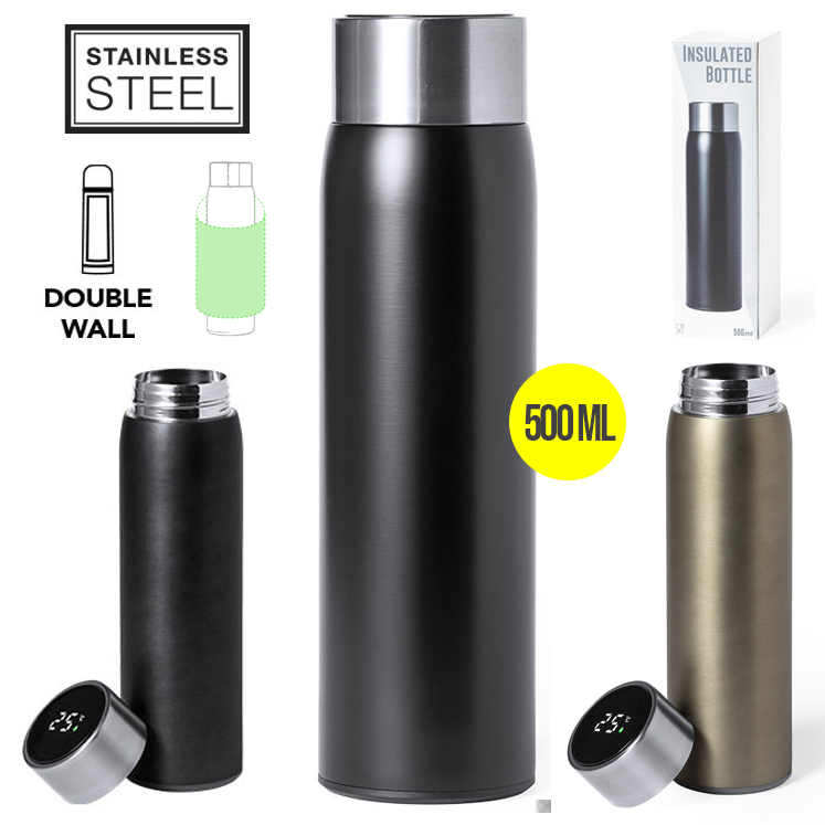 Bidón térmico de acero inox y doble pared, con medidor de temperatura táctil integrado en tapón. 500ml de capacidad y de acabado mate. Con tapón de seguridad libre de BPA y presentado en atractiva caja de diseño. Alimentación a pilas (de botón incluida) y disponible manual de instrucciones en español e inglés. 500 ml. Medidor Temperatura Táctil