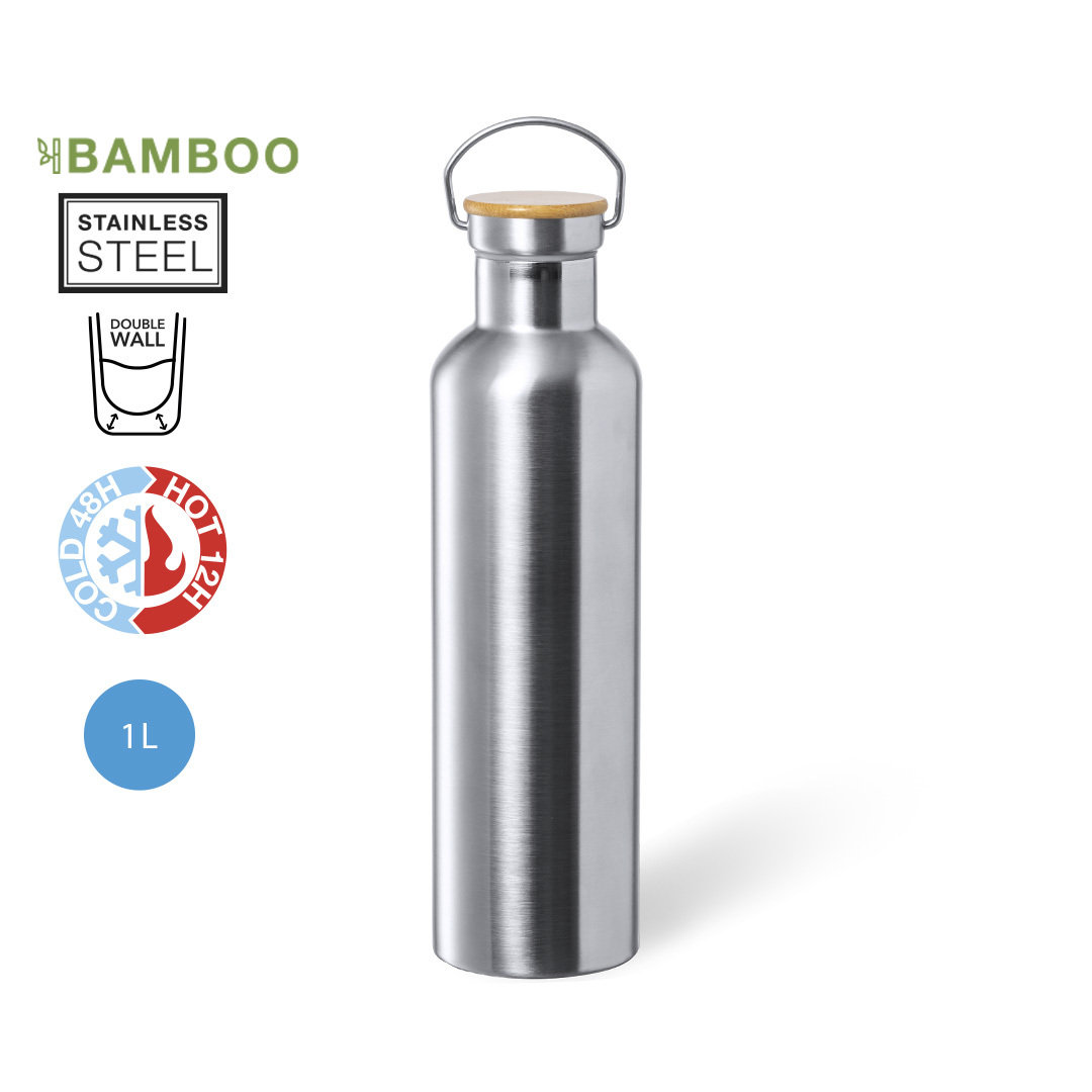 Bidón térmico de 1 l de capacidad, fabricado en acero inox de doble pared y acabado mate. Incluye original tapón a rosca en acero inox, con detalle de bambú y asa integrada. Libre de BPA y presentado en caja individual de diseño kraft. 1 L