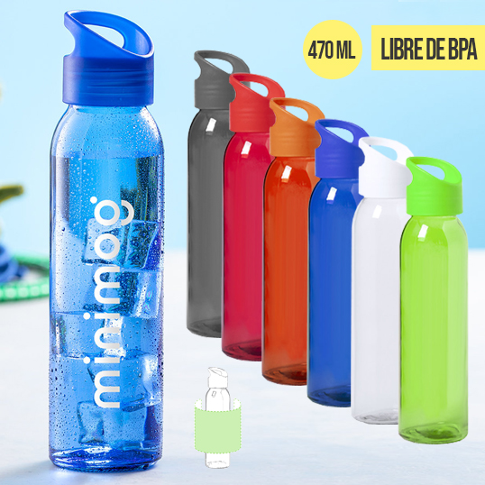 Bidón de 470ml de capacidad. Fabricado con cuerpo de cristal y disponible en variada gama de colores. Tapón a rosca en PP, libre de BPA, a juego. Presentado en caja individual de atractivo diseño. 470 ml