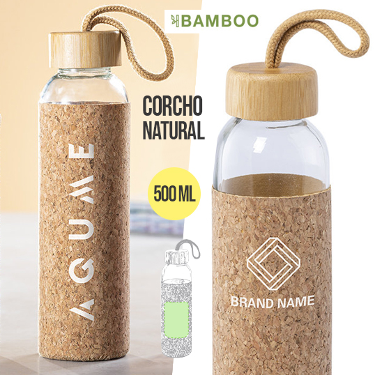 Bidón de línea nature de 500ml de capacidad. Fabricado con cuerpo de cristal y tapón a rosca de bambú, con práctica asa de transporte trenzada en color natural. Incluye funda de corcho natural y viene presentado en caja individual de atractivo diseño eco. 500 ml. Funda Corcho