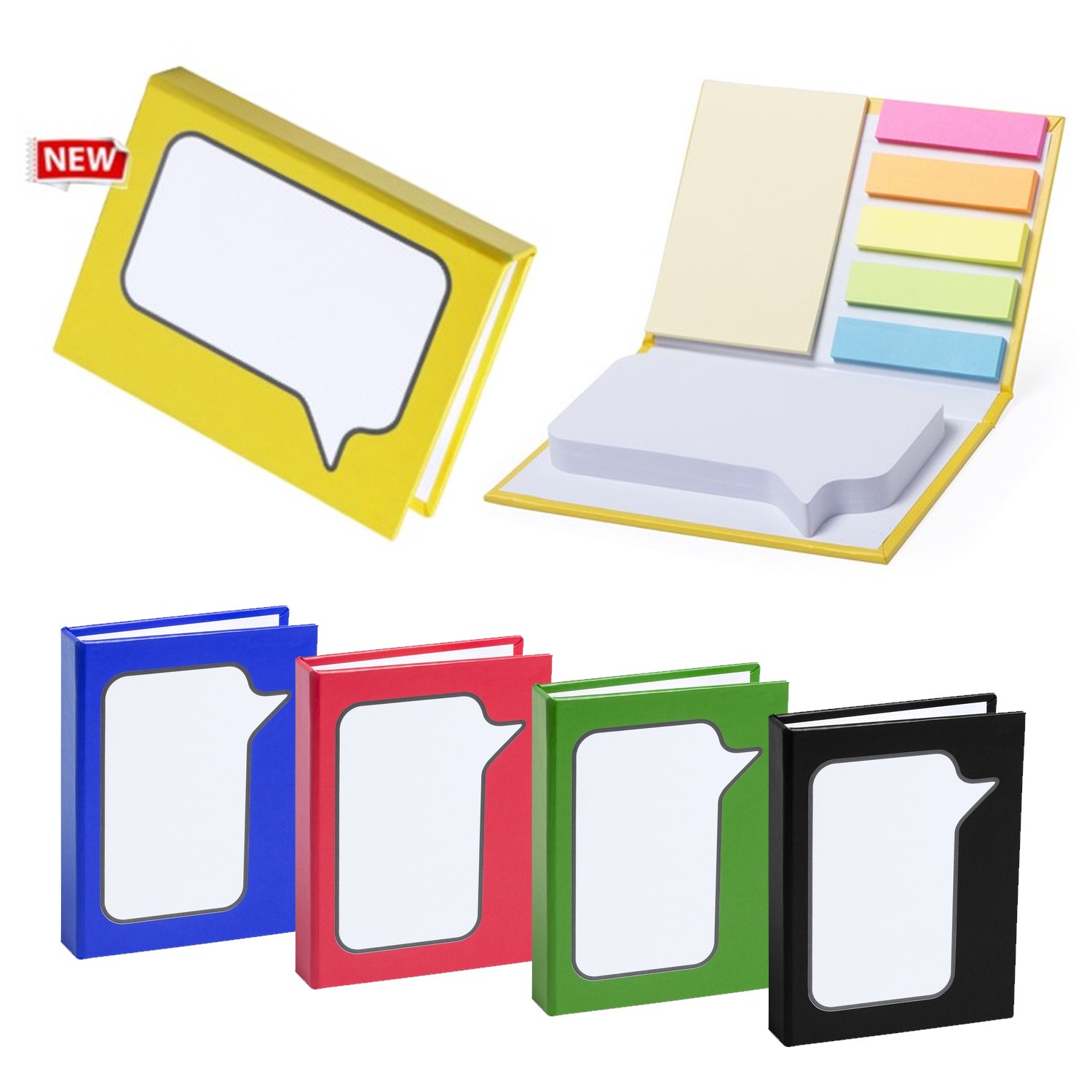 Original bloc de notas adhesivas con diseño de bocadillo y tapas de suave tacto acabadas en resistente cartón reciclado rígido de variados colores. Con 100 notas adhesivas grandes troqueladas en forma de bocadillo, 25 medianas y 125 mini notas adhesivas. 100 Notas Adhesivas 5,5 x 9,5 cm. 25 Notas Adhesivas 5 x 7,6 cm. 125 Mininotas Adhesivas 1,2 x 4,9 cm
