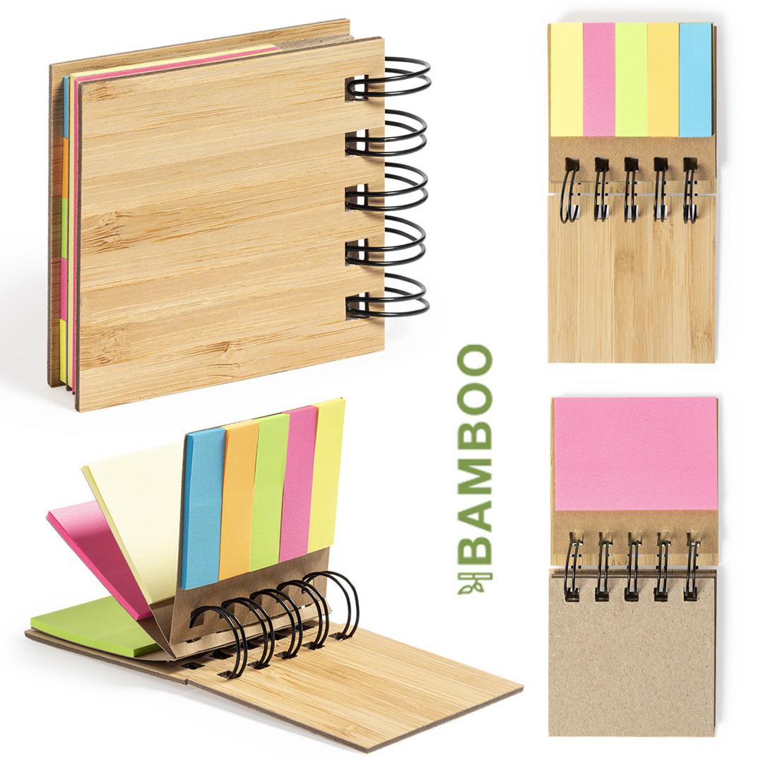 Bloc de notas de anillas de linea nature, con tapas rígidas de bambú. Con 75 notas adhesivas medianas y 125 mini notas adhesivas. 75 Notas Adhesivas 5 x 7 cm. 125 Mininotas Adhesivas 1,5 x 5 cm