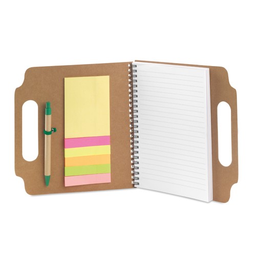 Bloc de notas adhesivas de anillas con bolígrafo de cartón reciclado incluido. De original diseño, con asas de transporte troqueladas y tapas de suave tacto acabadas en resistente cartón reciclado rígido. Con soporte para bolígrafo integrado, incluye bloc de 70 hojas con lineas horizontales, 25 notas adhesivas medianas y 125 mini notas adhesivas. Bloc 70 Hojas. 25 Notas Adhesivas 7,5 x 10 cm. 125 Mininotas Adhesivas 1,5 x 7,5 cm. Bolígrafo Cartón Reciclado Incluido