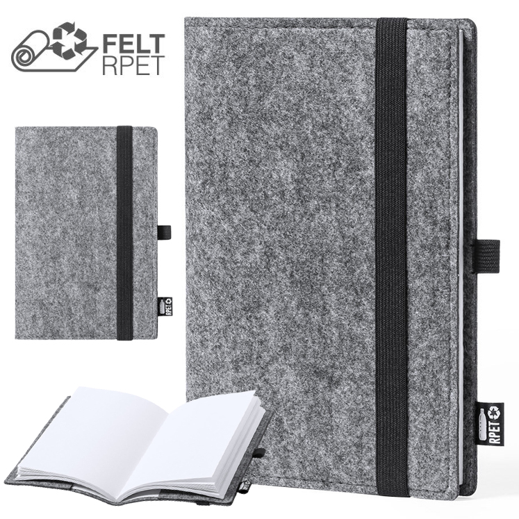 Bloc de notas A5 de línea nature con funda en fieltro RPETreciclado, fruto de la combinación del proceso de reciclaje de materiales plásticos junto con la técnica milenaria de fabricación del fieltro, dando como resultado un material de eco-tendencia que, además de ser de origen reciclado, también se convierte en reciclable.Incluye 100 hojas lisas. Con elástico de sujeción, soporte para bolígrafo y etiqueta RPET en portada. 100 Hojas