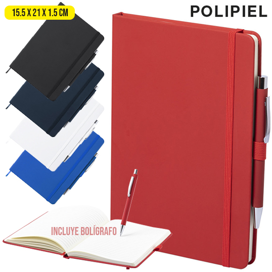 Set de bloc y bolígrafo a juego. Bloc de tapas rígidas con suave tacto acabado en polipiel, incluye soporte para bolígrafo, marcapáginas y cierre elástico, con interior de 100 hojas a una raya. Además, bolígrafo de aluminio en acabado goma con carga jumbo. Disponible en una variada gama de colores. Portada Rígida. 100 Hojas. Bolígrafo Aluminio Incluido. Carga Jumbo