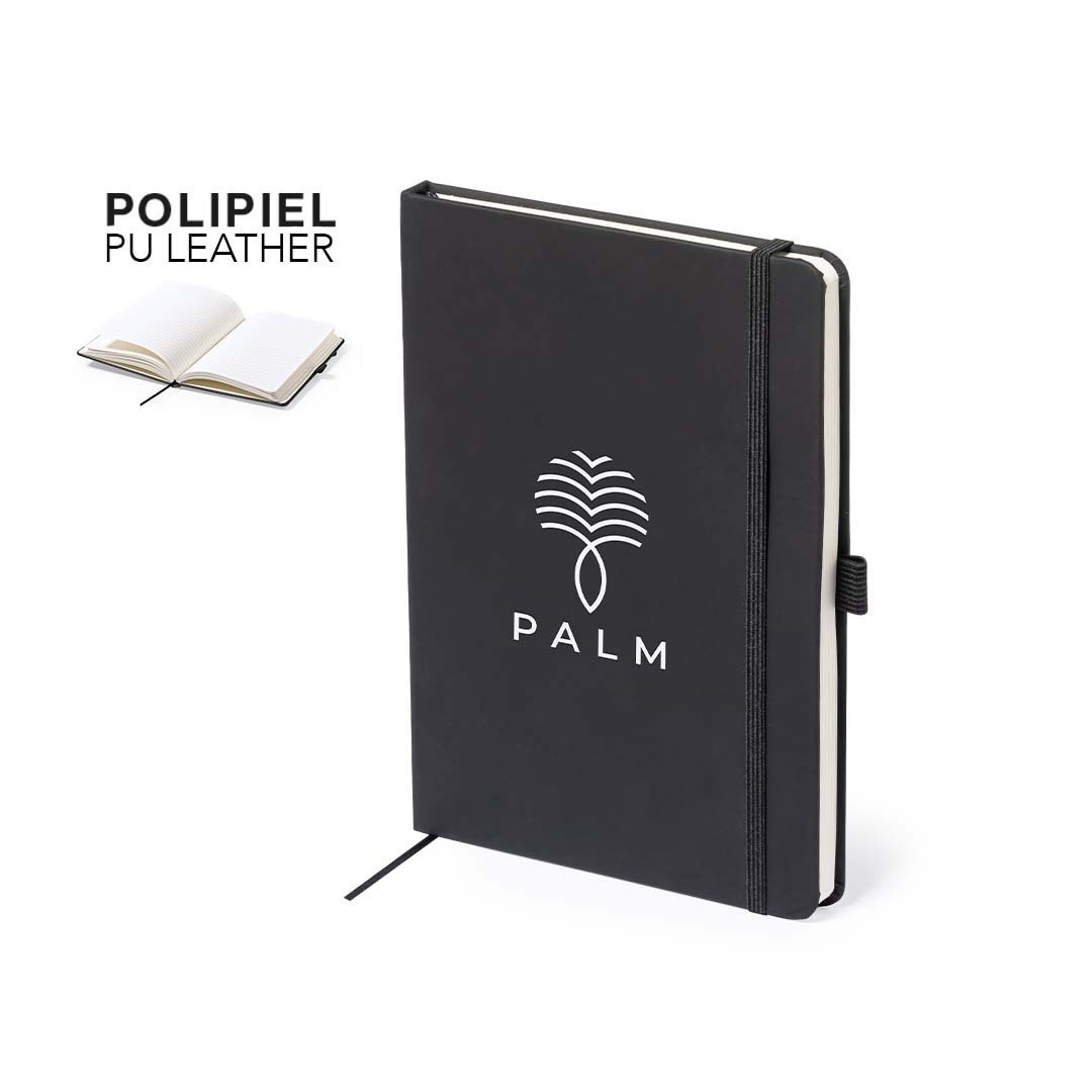 Bloc de notas fabricado en polipiel de elegante acabado en negro. Con tapas duras, marcapáginas y elástico de sujeción a juego. Interior con 100 hojas de disposición a 1 raya y soporte para bolígrafo (bolígrafo no incluido). Portada Rígida. 100 Hojas