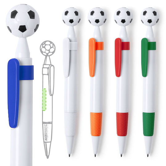 Bolígrafo para los más futboleros con detalle en forma de balón. De mecanismo pulsador y en desenfadado diseño bicolor. Con cuerpo en color blanco, con clip y empuñadura a juego, en variada gama de colores. Amplia superficie de impresión y en tinta azul.