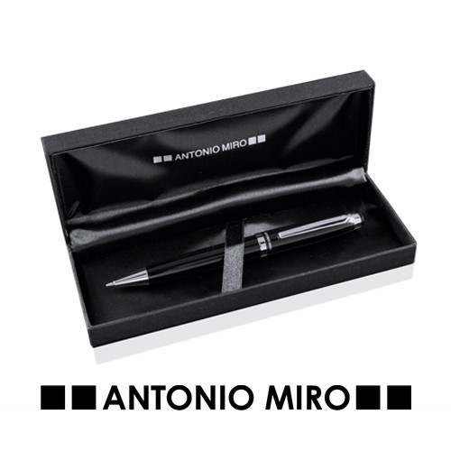 Bolígrafo de Antonio Miró en elegante diseño bicolor y suave cuerpo metálico en sobrio color negro. Con logotipo de la marca encima de la anilla, clip y punta en acabado plateado brillante. Presentado en estuche individual en color negro con logotipo de la marca. De cartucho jumbo con tinta azul. Carga Jumbo