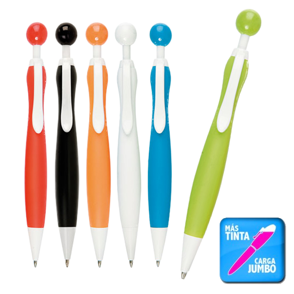 Bolígrafo de mecanismo pulsador de atrevido diseño bicolor con accesorios en color blanco sólido y cuerpo curvado de suave acabado en llamativos colores sólidos. Con original clip pulsador en forma de bola a juego. De cartucho jumbo y tinta azul. Carga Jumbo