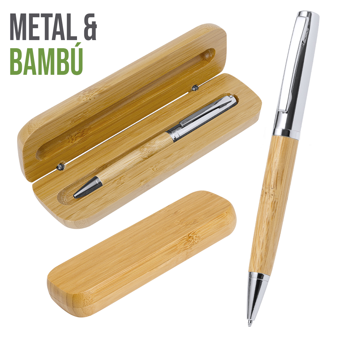 Elegante bolígrafo de bambú y metal con mecanismo giratorio. Cuerpo en resistente metal de acabado brillo y empuñadura en bambú . Clip metálico y en tinta azul. Presentado individualmente en un estuche de bambú. Materiales como el bambú fomentan la utilización de materias primas naturales, reduciendo las emisiones contaminantes. Proviene de una planta de gran resistencia y versatilidad, con crecimiento y regeneración rápidos, siendo una excelente alternativa al uso de madera tradicional.