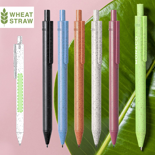Bolígrafo de línea nature con mecanismo pulsador. Cuerpo en caña de trigo y PP, para así fomentar la utilización de materias primas naturales y reducir las emisiones contaminantes. Clip con amplia superficie de marcaje y disponible en variada gama de colores pastel, con tinta azul. Con distintivo Wheat Straw en la parte superior del bolígrafo.