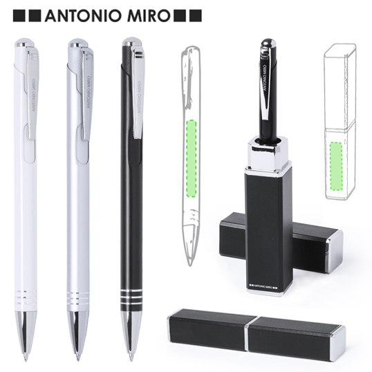Bolígrafo de Antonio Miró de elegante diseño y suave cuerpo en aluminio con accesorios en color plateado. De mecanismo pulsador, con parte superior y troquelado en cuerpo en trama de carbono. Original clip metálico y presentado en estuche individual de aluminio negro con logotipo de la marca. Tinta azul.