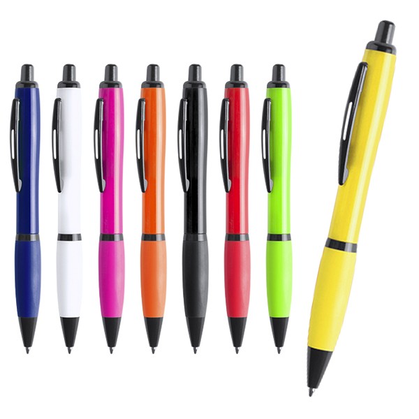 Bolígrafo de mecanismo pulsador de atrevido diseño bicolor con accesorios en negro y cuerpo de suave acabado en divertidos colores flúor. Con original clip metálico troquelado a juego y cómoda empuñadura. Tinta negra. Tinta Negra