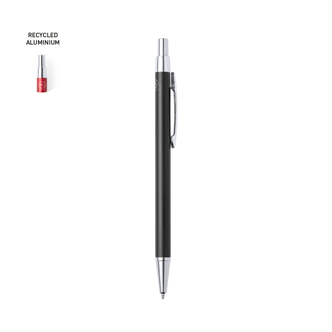 Bolígrafo eco-friendly fabricado en aluminio reciclado, cuyo origen se encuentra en la reutilización casi infinita de uno de los materiales con mayor potencial de reciclabilidad sin perder sus propiedades. Esta característica lo convierte en un material eco-friendly de origen reciclado, fácilmente reciclable y de cuyos procesos de tratamiento y desechos para la obtención del material se pueden obtener nuevos recursos reutilizables, consumiendo menos energía en su fabricación, entre otros factores de sostenibilidad. De mecanismo pulsador, con cuerpo disponible en variada gama de colores metalizados y accesorios en cromado. Con clip metálico, tinta azul y distintivo aluminio reciclado en la parte superior del bolígrafo. Certificación GRS (Global Recycled Standard / Estándar de Reciclaje Global), que garantiza el origen reciclado del material usado para fabricar el producto.