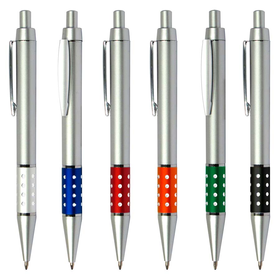 Bolígrafo Plástico Metalizado modelo "Alum", con anillo metálico con orificios. Escritura azul.