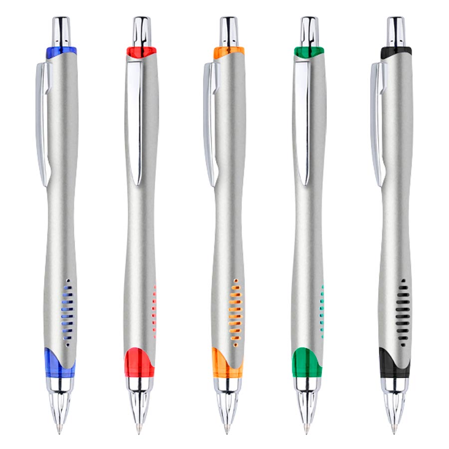 Bolígrafo plástico plateado "Motion". Escritura Azul.