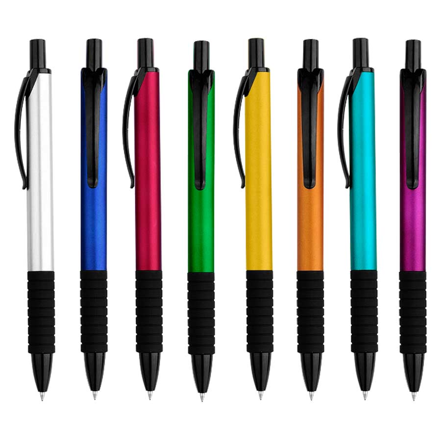 Bolígrafo "Vulcano" con cuerpo de color metalizado opaco y terminales negros. Escritura azul.