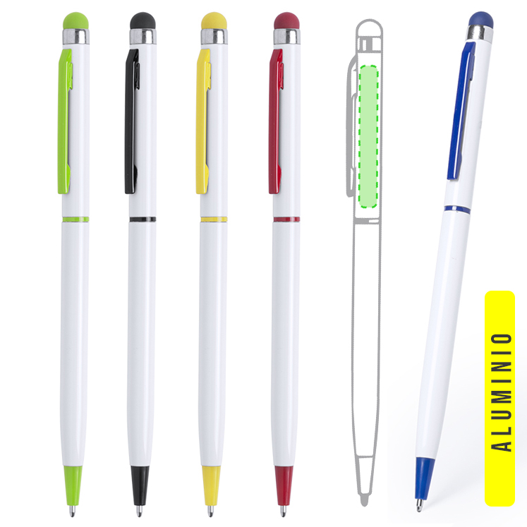 Bolígrafo puntero de mecanismo giratorio con cuerpo en aluminio de color blanco y accesorios en variada gama de vivos colores. Con clip troquelado y tinta azul.