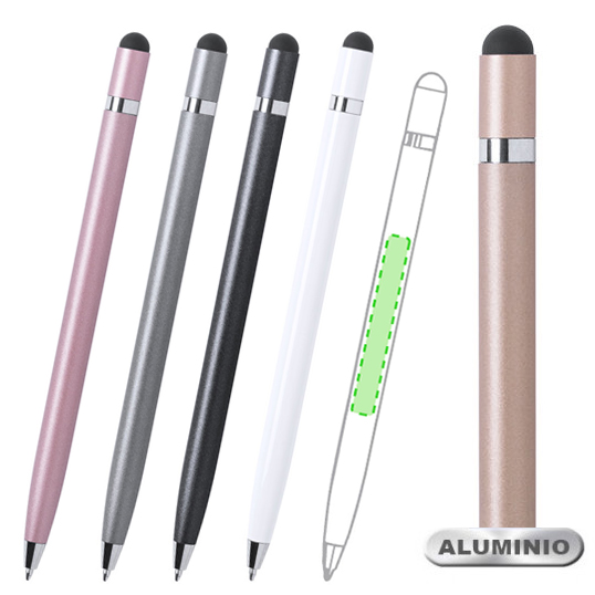 Bolígrafo puntero de mecanismo giratorio con cuerpo en aluminio de suave acabado metalizado. Con anilla cromada. Colores dorado, rosa, plateado y grafito con acabado brillo y color blanco con acabado mate. Tinta azul.