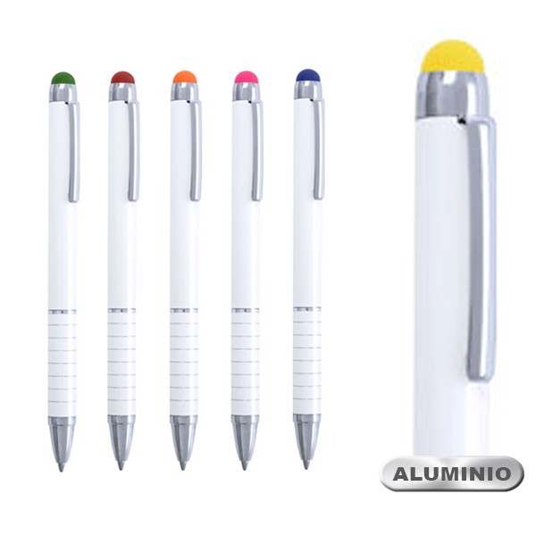 Bolígrafo puntero de mecanismo giratorio con cuerpo en aluminio de suave acabado metalizado en elegante color blanco. Accesorios y anillas en color plateado. Puntero en variados colores, original empuñadura anillada y tinta azul.