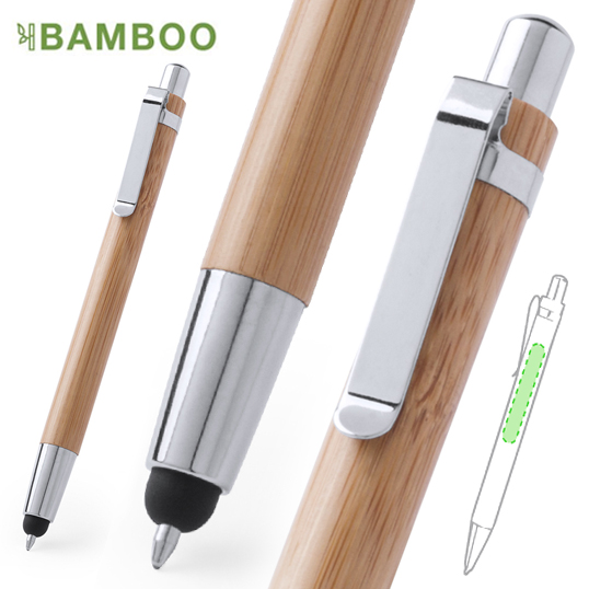 Elegante bolígrafo puntero de mecanismo pulsador con cuerpo en madera de bambú natural y accesorios de acabado metálico en color plateado brillante. De cartucho jumbo y tinta azul. Carga Jumbo