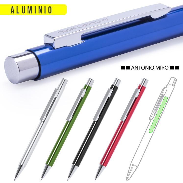 Bolígrafo de Antonio Miró con cuerpo en aluminio de variada gama de vivos colores y en color plateado. De mecanismo pulsador y presentado en bolsita don logotipo de la marca. Tinta azul.