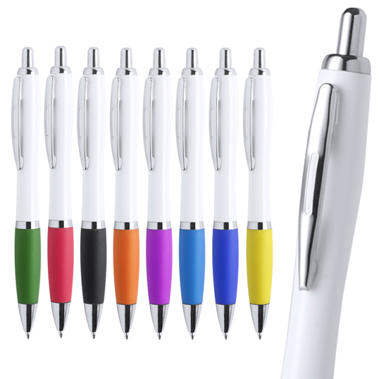 Bolígrafo de colorido diseño bicolor, con cuerpo acabado en color blanco y empuñadura en variada gama de llamativos colores. De mecanismo pulsador, con detalles cromados, clip metálico y tinta azul.
