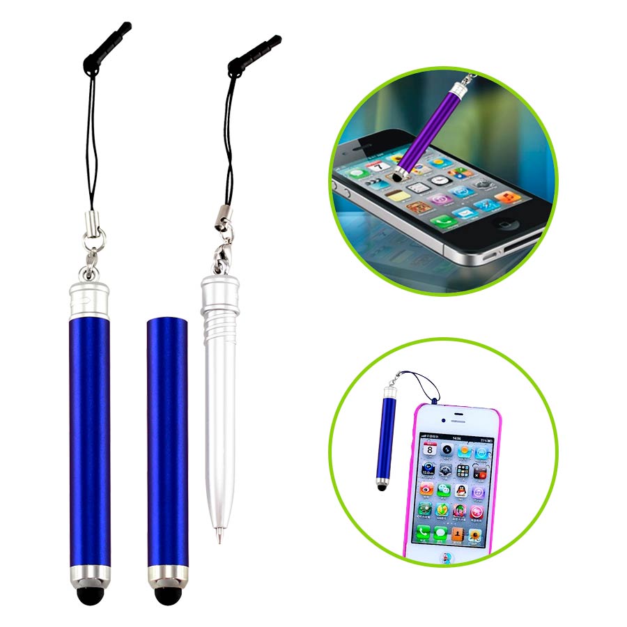 Bolígrafo "Touch-Screen" con cuerpo plateado, tapa de color metalizado y goma posterior negra para pantalla táctil. Incluye práctico soporte plástico para insertar en la salida de auricular del iPhone. Escritura azul.