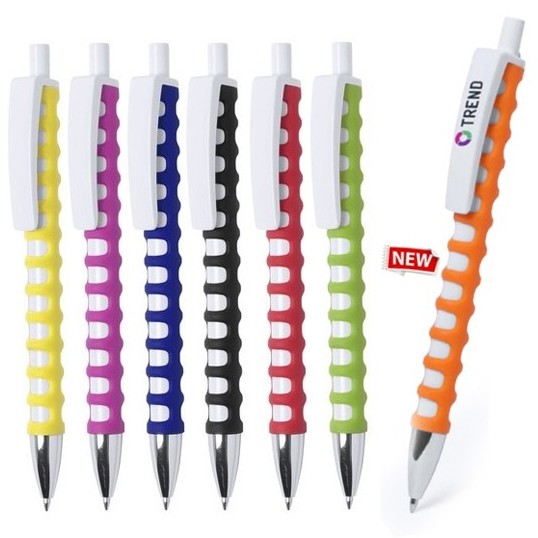 Bolígrafo de mecanismo pulsador de original diseño, con cuerpo troquelado de suave tacto goma en vivos colores. Con clip maxi en color blanco para marcaje y punta en color plateado brillante.