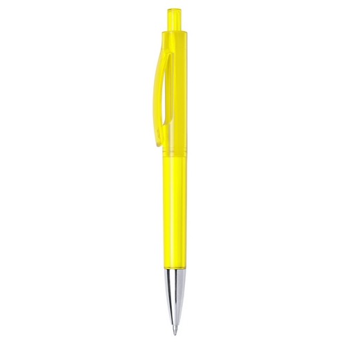 Bolígrafo de mecanismo pulsador de original diseño transparente y sólido en vivos colores y cuerpo de suave acabado. Con original clip curvado a juego y punta en acabado brillante. De cartucho jumbo y tinta azul. Carga Jumbo