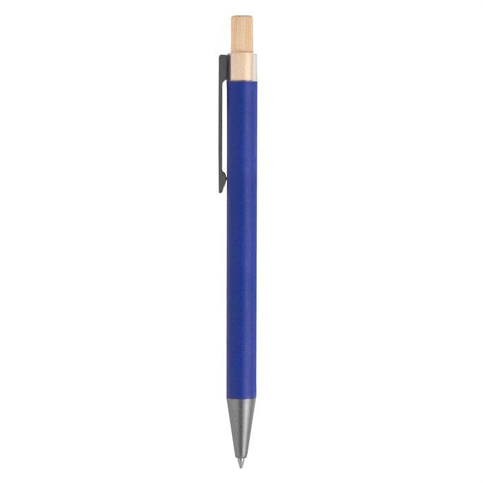 Aluminio y bambú. Bolígrafo retráctil. Cuerpo metálico en diferentes colores acabado mate. Clip metálico y puntera plástica color gris acabado mate. Pulsador de bambú. Tinta negra.