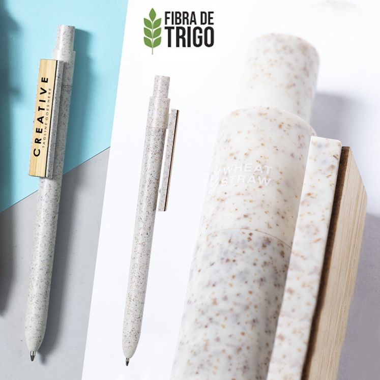 Bolígrafo de línea nature y mecanismo pulsador. Cuerpo fabricado en combinación de caña de trigo y clip en bambú, para así fomentar la utilización de materias primas naturales y reducir las emisiones contaminantes. Clip con amplia zona de marcaje y en tinta azul. Distintivo caña de trigo en la parte superior del bolígrafo.