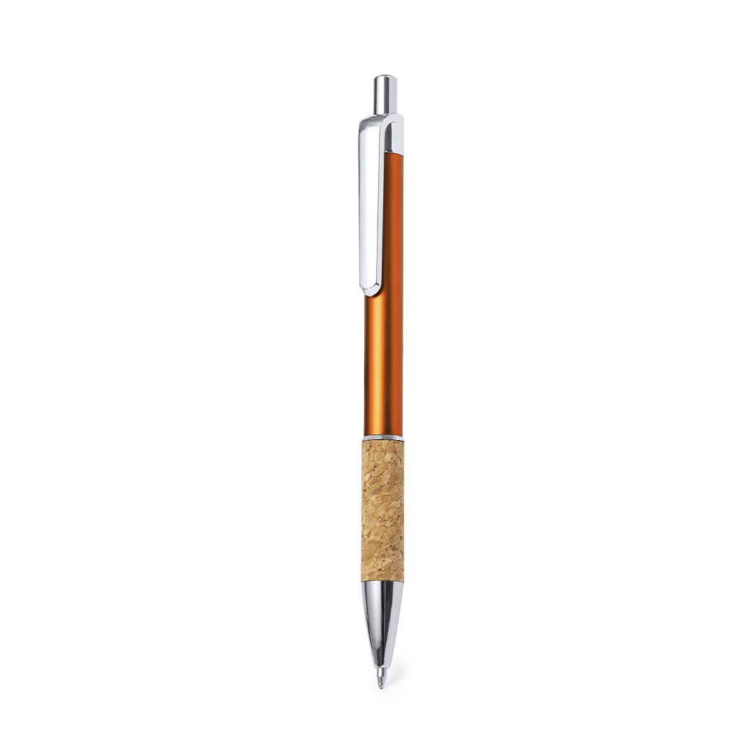Elegante bolígrafo de corcho y aluminio con mecanismo pulsador. Cuerpo en resistente aluminio de acabado brillante y empuñadura en corcho, con la caña en una amplia gama de distintivos colores. Clip metálico, y en tinta azul. Presentado en bolsa individual reciclada. Elaborado con elementos vegetales para así fomentar la utilización de materias primas naturales y reducir las emisiones contaminantes.