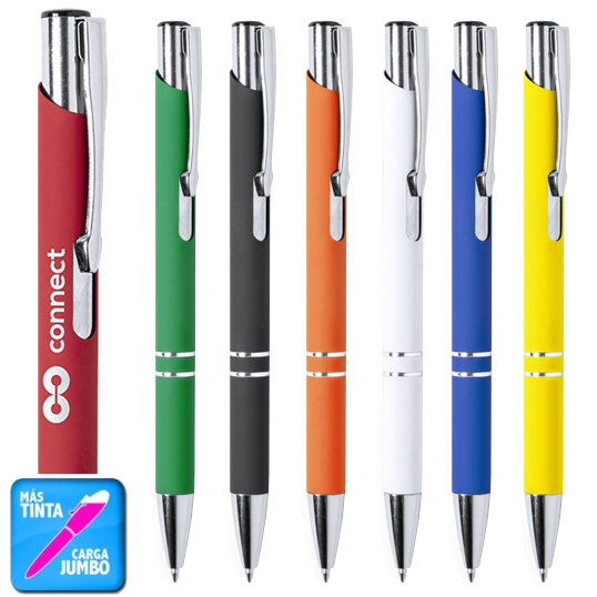 Original bolígrafo de mecanismo pulsador en elegante diseño bicolor. Con cuerpo troquelado de aluminio en tacto goma de acabado mate. Especialmente diseñado para marcaje en láser y mostrar el logotipo en tono plateado. Original clip, anillas y punta en plateado. Disponible en variada gama de colores, con cartucho jumbo y tinta azul. Carga Jumbo