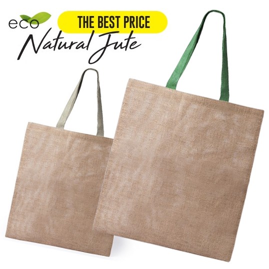 Bolsa ecológica de yute con cuerpo en color natural y asas medianas de 52cm en color verde. De acabado cosido y resistencia hasta 9kg de peso.